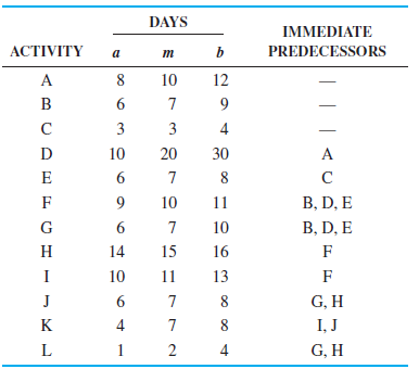 DAYS IMMEDIATE АСTIVITY a m b PREDECESSORS A 8 10 12 В 6 7 9. C 3 3 4 D 10 20 30 A E 6. 7 8 F 9 10 11 В, D, E G 6. 7 10 B, D, E 14 15 16 F I 10 11 13 F J 7 8 G, H K 4 7 8 I, J L 1 4 G, H ||| < U 2.