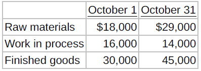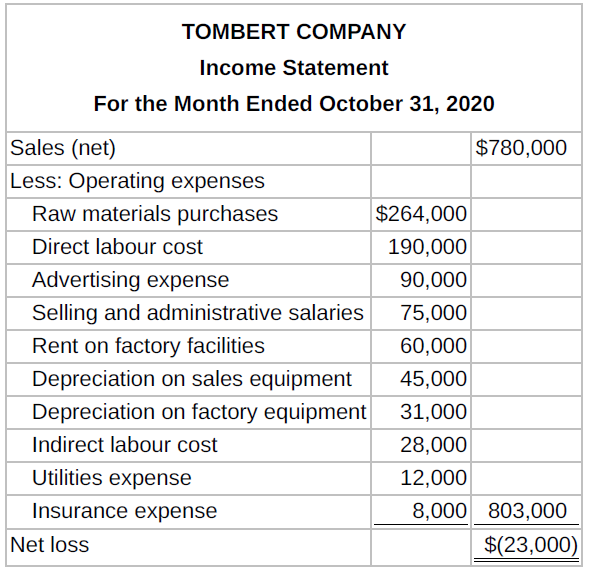 TOMBERT COMPANY Income Statement For the Month Ended October 31, 2020 Sales (net) $780,000 Less: Operating expenses Raw materials purchases $264,000 Direct labour cost 190,000 Advertising expense 90,000 Selling and administrative salaries 75,000 Rent on factory facilities 60,000 Depreciation on sales equipment 45,000 Depreciation on factory equipment Indirect labour cost 31,000 28,000 Utilities expense 12,000 Insurance expense 8,000 803,000 Net loss $(23,000) October 1 October 31 Raw materials $18,000 $29,000 Work in process 16,000 14,000 Finished goods 30,000 45,000
