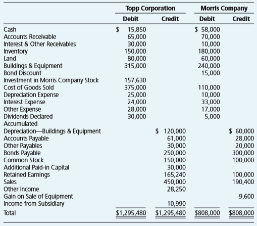 Тоpp Corporation Morris Company Debit Credit Debit Credit $ 15,850 65,000 30,000 150,000 80,000 315,000 $ 58,000 70,000 10,000 180,000 60,000 240,000 15,000 Cash Accounts Receivable Interest & Other Receivables Inventory Land Buildings & Equipment Bond Discount Investment in Morris Company Stock Cost of Goods Sold Depreciation Expense Interest Expense Other Expense Dividends Declared 157,630 375,000 25,000 24,000 28,000 30,000 110,000 10,000 33,000 17,000 5,000 Accumulated Depreciation-Buildings & Equipment Accounts Payable Other Payables Bonds Payable Common Stock Additional Paid-in Capital Retained Earnings Sales Other Income $ 120,000 61,000 30,000 250,000 150,000 30,000 165,240 450,000 28,250 $ 60,000 28,000 20,000 300,000 100,000 100,000 190,400 Gain on Sale of Equipment Income from Subsidiary 9,600 10,990 $1,295,480 $1,295,480 $808,000 $808,000 Total