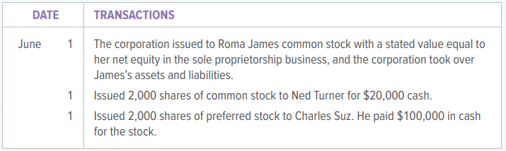 The corporation is authorized to issue 100,000 shares of no-par-value common stock with a stated value of $10 per share and 20,000 shares of $100 par-value preferred stock. The preferred stock bears a dividend of $5 per share per year. The transactions entered into at the time the corporation was formed follow.