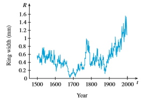 Trees grow faster and form wider rings in warm years and grow more slowly and form narrower rings in cooler years. The figure shows ring widths of a Siberian pine from 1500 to 2000.