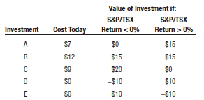 Value of Investment if: S&P/TSX S&P/TSX Investment Cost Today Return < 0% Return > 0% A $7 $0 $15 B $12 $15 $15 $9 $20 D $0 -$10 $10 E $0 $10 -$10