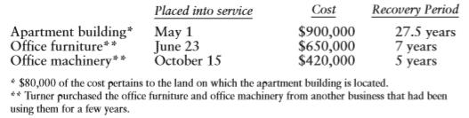 Recovery Period 27.5 years 7 years 5 years Placed into service Cost Apartment building* May 1 Office furniture** Office machinery** June 23 October 15 $900,000 $650,000 $420,000 * $80,000 of the cost pertains to the land on which the apartment building is located. ** Turner purchased the office furniture and office machinery from another business that had been using them for a few years.