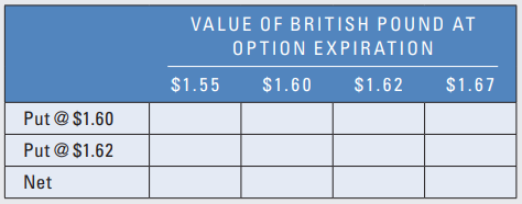 Two British pound (£) put options are available with exercise prices of $1.60 and $1.62. The premiums associated with these options are $0.03 and $0.04 per unit, respectively. (See Appendix B in this chapter.)