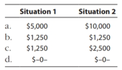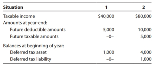 Situation 1 2 Taxable income $40,000 $80,000 Amounts at year-end: Future deductible amounts 5,000 10,000 Future taxable amounts -0- 5,000 Balances at beginning of year: Deferred tax asset 1,000 4,000 Deferred tax liability -0- 1,000 Situation 1 Situation 2 a. $5,000 $10,000 b. $1,250 $1,250 C. $1,250 $2,500 d. $-0- $-0-