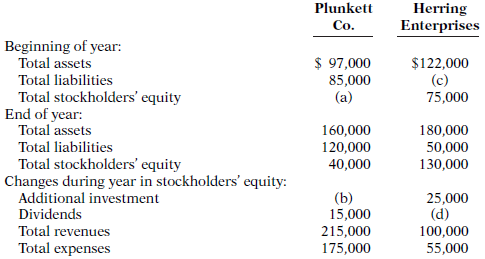 Plunkett Herring Enterprises Со. Beginning of year: Total assets $ 97,000 $122,000 (c) 75,000 Total liabilities 85,000 (a) Total stockholders' equity End of year: Total assets 160,000 120,000 40,000 180,000 Total liabilities Total Stockholders' equity Changes during year in stockholders' equity: Additional investment Dividends 50,000 130,000 (b) 15,000 215,000 25,000 (d) 100,000 55,000 Total revenues Total expenses 175,000