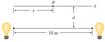 Two light sources of identical strength are placed 10 m apart. An object is to be placed at a point P on a line ,l, parallel to the line joining the light sources and at a distance d meters from it (see the figure). We want to locate P on , so that the intensity of illumination is minimized.