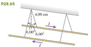 Two long, parallel wires hang by 4.00-cm-long cords from a common axis (Fig. P28.65). The wires have a mass per unit length of 0.0125 kg/m and carry the same current in opposite directions. What is the current in each wire if the cords hang at an angle of 6.000 with the vertical?