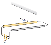 Two long, straight conducting wires with linear mass density λ are suspended from cords so that they are each horizontal, parallel to each other, and a distance d apart. The back ends of the wires are connected to each other by a slack, low resistance connecting wire. A charged capacitor (capacitance C) is now added to the system; the positive plate of the capacitor (initial charge +Q0) is connected to the front end of one of the wires, and the negative plate of the capacitor (initial charge -Q0) is connected to the front end of the other wire (Fig. P28.79). Both of these connections are also made by slack, low-resistance wires. When the connection is made, the wires are pushed aside by the repulsive force between the wires, and each wire has an initial horizontal velocity of magnitude v0. Assume that the time constant for the capacitor to discharge is negligible compared to the time it takes for any appreciable displacement in the position of the wires to occur.