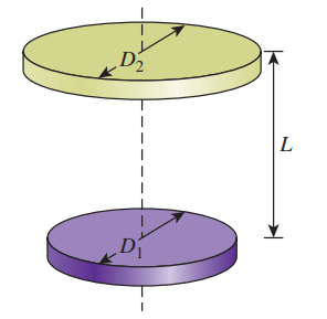 > Reconsider Prob. 21–75. Using appropriate software, evaluate the effect of the distance L between the black coaxial parallel disks (D = 1 m) on the radiation heat transfer coefficient. By varying the distance L between the disks from 0.