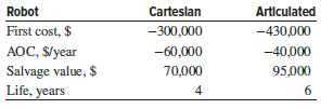 Two types of robots (Cartesian and Articulated) with the following estimates are under consideration for a dishwasher assembly process. Using an interest rate of 10% per year, determine which one should be selected on the basis of an annual worth analysis.