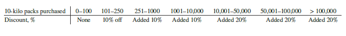 Years ago | 8 10-kilo packs 100 76 5 4 3 2 1 150 500 800 1100 1400 1700 2000 10-kilo packs purchased 0-100 Discount, % None 101-250 10% off 251-1000 Added 10% 1001-10,000 Added 10% 10,001-50,000 Added 20% 50,001-100,000 Added 20% > 100,000 Added 20%