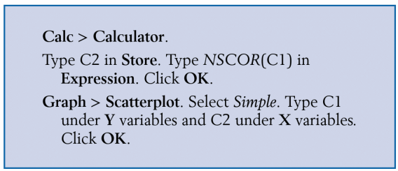 We illustrate a normal-scores plot using MINITAB. With the data set in column 1, the MINITAB commands will create a normal-scores plot for the observations in Cl. (MINITAB uses a variant of the normal scores, m;, that we defined.)