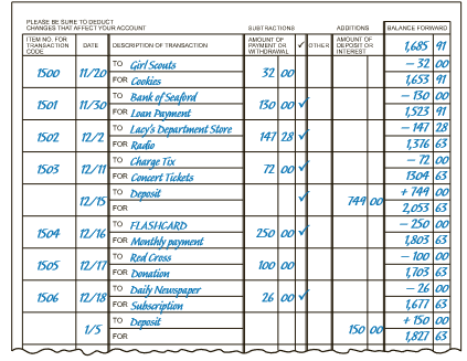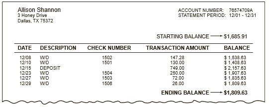 Allison Shannon 3 Honey Drive Dallas, TX 75372 ACCOUNT NUMBER: 76574709A STATEMENT PERIOD: 12/01 - 12/31 STARTING BALANCE +$1,685.91 DATE DESCRIPTION CHECK NUMBER TRANSACTION AMOUNT BALANCE $ 1,538.03 $ 1,408.83 $2,157.83 $ 1,907.83 $ 1,835.83 $ 1,809.83 12/08 12/10 W/D 1502 1501 147.28 130.00 W/D DEPOSIT W/D 12/15 12/23 12/27 749.00 250.00 72.00 26.00 1504 W/D W/D 1503 1508 12/29 ENDING BALANCE $1,809.63 PLEASE BE BUME TO DEDUCT CHANGES THAI AFFECTYOUR AOCOUNT TEM NO. FOR aUBTRACTIONS ADDTIONS BALANCE FORIWRD DESCPTION OF THANSACTION AMOUNT OF PAYMENT DR WITHDRAWL OTHER DEPOSITOR INTET 1685 91 TRANSAC TION DATE TO Girl Scouts 11/20 FOR Cookies - 32|00 1653 91 - 3000 1,523 91 - 147 |28 1,376 63 - 72Jo0 1304 63 + 749 00 2,053 63 - 250 00 1803 63 - too 00 703 63 - 26 |0 7677 |63 + 150 0 1,827 |63 1500 32 o0 TO Bank of Seaford 11/30 FOR Loan Aryment 1501 B0 00M TO Lasy's Department Store 12/2 147 28 1502 FOR Radio TO Charge Tix 12/1 FOR Concert Tickets TO Deposit 12/15 1503 72 o0 749 00 FOR TO FLASHCARD 12/16 FOR Monthy payment 1504 250 00 TO Red Cross 12/17 FOR Donation 1505 100 00 TO Daily NeuspMper 12/18 FOR Subsaription 1506 26 00 TO Depesit 1/5 FOR 150 00