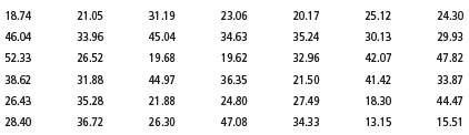 18.74 21.05 31.19 23.06 20.17 25.12 24.30 46.04 33.96 45.04 34.63 35.24 30.13 29.93 52.33 26.52 19.68 19.62 32.96 42.07 47.82 38.62 31.88 44.97 36.35 21.50 41.42 33.87 26.43 35.28 21.88 24.80 27.49 18.30 44.47 28.40 36.72 26.30 47.08 34.33 13.15 15.51