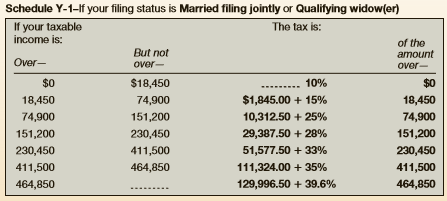 Schedule Y-1-If your filing status is Married filing jointly or Qualifying widow(er) If your taxable income is: The tax is: of the amount But not Over- over- over- $0 $18,450 10% $0 18,450 74,900 $1,845.00 + 15% 18,450 74,900 151,200 10,312.50 + 25% 74,900 151,200 230,450 29,387.50 + 28% 151,200 230,450 411,500 51,577.50 + 33% 230,450 411,500 464,850 111,324.00 + 35% 411,500 464,850 129,996.50 + 39.6% 464,850