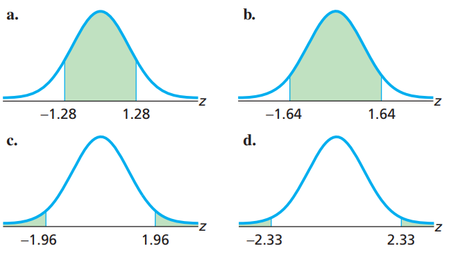 > Illustrate your work with graphs. Determine the two z-scores that divide the area under the standard normal curve into a middle 0.90 area and two outside 0.05 areas.