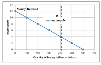 Use the accompanying graphs to show what happens in the economy when M increases from $300 billion to $400 billion.