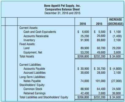 > The 2016 comparative balance sheet and income statement of Bone Appetit Pet Supply, Inc., are: Bone Appetit Pet Supply, Inc., had no noncash investing and financing transactions during 2016. During the year, Bone Appetit Pet Supply, Inc., made no sale