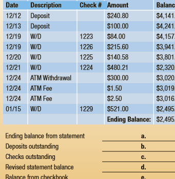 Date Description 12/12 Deposit Check # Amount Balanc $240.80 $4,141. 12/13 Deposit $100.00 $4,241. 12/19 W/D 1223 $84.00 $4,157. 12/19 W/D 1226 $215.60 $3,941. 12/20 W/D 1225 $140.58 $3,801. 12/21 W/D 1224 $480.21 $2,320. 12/24 ATM Withdrawal $300.00 $3,020. 12/24 ATM Fee $1.50 $3,019. 12/24 ATM Fee $2.50 $3,016. $2,495. Ending Balance: $2,495. 01/15 W/D 1229 $521.00 Ending balance from statement a. Deposits outstanding b. Checks outstanding C. Revised statement balance d. Balance from checkbook