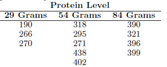 The study Loss of Nitrogen Through Sweat by Preadolescent Boys Consuming Three Levels of Dietary Protein was conducted by the Department of Human Nutrition and Foods at Virginia Tech to determine perspiration nitrogen loss at various dietary protein levels. Twelve preadolescent boys ranging in age from 7 years, 8 months to 9 years, 8 months, all judged to be clinically healthy, were used in the experiment. Each boy was subjected to one of three controlled diets in which 29, 54, or 84 grams of protein were consumed per day. The following data represent the body perspiration nitrogen loss, in milligrams, during the last two days of the experimental period: