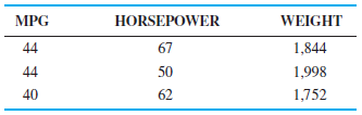 MPG HORSEPOWER WEIGHT 44 67 1,844 44 50 1,998 40 62 1,752 MPG HORSEPOWER WEIGHT 37 69 1,980 37 66 1,797 34 63 2,199 35 90 2,404 32 99 2,611 30 63 3,236 28 91 2,606 26 94 2,580 26 88 2,507 25 124 2,922 22 97 2,434 20 114 3,248 21 102 2,812 18 114 3,382 18 142 3,197 16 153 4,380 16 139 4,036