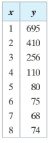 > Use the data shown in the table at the left. Find the equation of the regression line for the data. Then construct a scatter plot of (x, y) and sketch the regression line with it. y 1 695 2 410 3 256 4 110 5 80 75 7 68 8 74