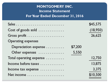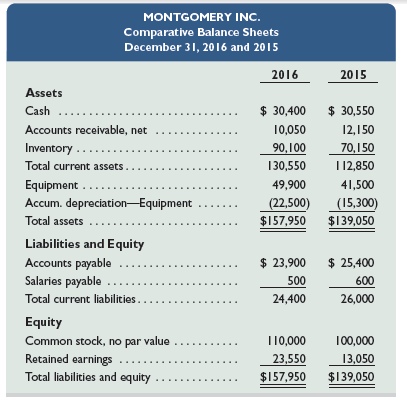 MONTGOMERY INC. Comparative Balance Sheets December 31, 2016 and 2015 2016 2015 Assets Cash $ 30,400 $ 30,550 Accounts receivable, net 10,050 12,150 Inventory . 90,100 70,150 Total current assets. 130,550 1 12,850 Equipment . Accum. depreciation-Equipment Total assets 49,900 41,500 (22,500) (15,300) $157,950 $139,050 Liabilities and Equity Accounts payable $ 23,900 $ 25,400 Salaries payable ... 500 600 Total current liabilitios. 24,400 26,000 Equity Common stock, no par value Retained earnings Total liabilities and equity T10,000 100,000 23,550 13,050 $157,950 $139,050 MONTGOMERY INC. Income Statement For Year Ended December 31, 2016 Sales ... $45,575 Cost of goods sold Gross profit ..... Operating expenses (18,950) 26,625 depreciation expense Other expenses Total operating expense $7,200 5,550 12,750 Income before taxes 13,875 Income tax expense 3,375 Net income $10,500