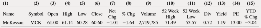 (1) (2) (3) (4) (5) (6) (7) (8) (9) (10) (11) (12) (13) (14) (15) Net 52 Week 52 Week YTD Name Symbol Open High Low Close % Chg Volume Div Yield PE % Chg Chg 61.00 61.14 60.28 60.60 -1.01 -1.64 2,719,785 High 71.49 Low McKesson МСК 53.57 0.72 1.19 13.00 -3.04