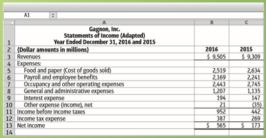 A1 Gagnon, Inc. Balance Sheets (Adapted) December 31, 2016 and 2015 1 2. 3 (Dollar amounts in millions) 4 Assets Increase (Decrease) Percentage 2016 2015 Amount Current assets: Cash and cash equivalents $ 1,202 $ 902 $ 300 (76) (10) 8. 6. 33.3% Short-term investments Receivables, net Inventories Prepaid expenses and other assets Total current assets (90.5) (3.9) 9.8 8. 84 8 9. 246 256 90 82 10 242 1,788 3,642 1,010 820 344 1,668 3,306 (102) 120 336 (29.7) 7.2 11 12 Property, plant, and equipment, net 10.2 13 Intangible assets 858 152 17.7 14 Other assets 732 88 Total assets $ 7,260 $ 6,564 12.0 10.6% 15 $ 696 16 Liabilities and Stockholders' Equity Current liabilities: Accounts payable 17 $ 884 70 118 72 1,144 2,844 1,076 5,064 18 $ 978 40 124 70 1,212 3,514 1,168 5,894 94 (30) 6. (2) 68 670 92 830 10.6% (42.9) 5.1 (2.8) 5.9 23.6 19 Income tax payable 20 Short-term debt Other Total current liabilities Long-term debt 21 22 23 24 Other liabilities 8.6 16.4 25 Total liabilities 26 Stockholders' Equity: Common stock Retained earnings Accumulated other comprehensive (loss) Total stockholders' equity Total liabilities and stockholders' equity 27 1,532 (168) 1,366 $ 7,260 1,670 (172) 1,500 $ 6,564 (138) (8.3) (2.3) (8.9) 10.6% 28 29 (134) $ 696 30 31 32 A1 Gagnon, Inc. Statements of Income (Adapted) Year Ended December 31, 2016 and 2015 1. 2 (Dollar amounts in millions) 3 Revenues 4 Expenses: Food and paper (Cost of goods sold) Payroll and employee benefits Occupancy and other operating expenses General and administrative expenses Interest expense 2016 2015 $ 9,505 $ 9,309 2,519 2,169 2,443 1,207 194 21 952 387 $ 565 2,634 2,241 2,745 1,135 147 (35) 442 269 $ 173 Other expense (income), net 11 Income before income taxes 12 Income tax expense 13 Net income 10 14 6789 012 34