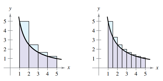 Use the rectangles in each graph to approximate the area of the region bounded by y = 5/x, y = 0, x = 1, and x = 5. Describe how you could continue this process to obtain a more accurate approximation of the area.