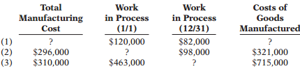 Costs of Goods Total Work in Process (1/1) Work in Process (12/31) Manufacturing Cost Manufactured (1) (2) (3) $120,000 $82,000 $98,000 ? ? $296,000 $310,000 $321,000 $463,000 $715,000 Direct Direct Total Materials Labor Manufacturing Costs Factory Overhead $ 50,000 $140,000 $111,000 Used Used (1) $40,000 (2) (3) $55,000 $61,000 $75,000 ? $296,000 $310,000 ?