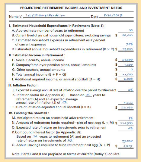 PROJECTING RETIREMENT INCOME AND INVESTMENT NEEDS Name(s) Leo g Frances Pendelton 8/31/2017 Date I. Estimated Household Expenditures in Retirement (Note 1): A. Approximate number of years to retirement 30 B. Current level of annual household expenditures, excluding savings %24 56,000 C. Estimated household expenses in retirement as a percent of current expenses D. Estimated annual household expenditures in retirement (B × C) $, II. Estimated Income in Retirement : 39,200 E. Social Security, annual income %24 24,000 F. Companylemployer pension plans, annual amounts %24 9,000 %24 G. Other sources, annual amounts H. Total annual income (E + F+ G) I. Additional required income, or annual shortfall (D – H) I. Inflation Factor : J. Expected average annual rate of inflation over the period to retirement %24 33,000 6,200 5% K. Inflation factor (in Appendix A): Based on 30 years to retirement (A) and an expected average annual rate of inflation (J) of 5% 4.322 L. Size of inflation-adjusted annual shortfall (I x K) $ 26,796 IV. Funding the Shortfall : M. Anticipated return on assets held after retirement N. Amount of retirement funds required-size of nest egg (L + M) $ 334,950 O. Expected rate of return on investments prior to retirement P.Compound interest factor (in Appendix B): Based on 30 years to retirement (A) and an expected rate of return on investments of 6% Q. Annual savings required to fund retirement nest egg (N - P) 8% 79.058 %24 4,237 Note: Parts I and Il are prepared in terms of current (today's) dollars.