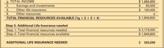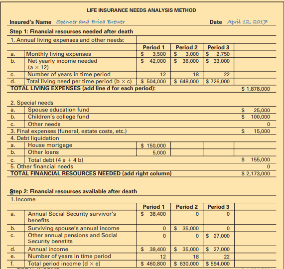 LIFE INSURANCE NEEDS ANALYSIS METHOD Insured's Name Spencer and Erica Brewer Date April 12, 2017 Step 1: Financial resources needed after death 1. Annual living expenses and other needs: Period 2 3,000 $ $ 36,000 Period 3 2,750 Period 1 |Monthly living expenses Net yearly income needed (ах 12) Number of years in time period Total living need per time period (b x c) TOTAL LIVING EXPENSES (add line d for each period): a. $ 3,500 b. $ 42,000 $ 33,000 C. 12 18 22 d. $ 504,000 $ 648,000 $ 726,000 $ 1,878,000 2. Special needs Spouse education fund Children's college fund Other needs a. $ 25,000 b. $ 100,000 C. 3. Final expenses (funeral, estate costs, etc.) 4. Debt liquidation House mortgage 2$ 15,000 а. $ 150,000 b. Other loans 5,000 Total debt (4 a + 4 b) 5. Other financial needs TOTAL FINANCIAL RESOURCES NEEDED (add right column) $ 155,000 C. $ 2,173,000 Step 2: Financial resources available after death 1. Income Period 1 Period 2 Period 3 Annual Social Security survivor's benefits $ 38,400 a. Surviving spouse's annual income Other annual pensions and Social Security benetits b. $ 35,000 $ 27,000 C. d. Annual income $ 38,400 $ 35,000 S 27,000 Number of years in time period 12 18 22 е. f. Total period income (d x e) $ 460,800 $ 630,000 $ 594,000 g. TOTAL INCOME $ 1,684,800 Savings and investments Other life insurance Other resources 2. 65,000 3. $ 100,000 4. TOTAL FINANCIAL RESOURCES AVAILABLE (1g + 2 + 3 + 4) $ 1,849,800 Step 3: Additional Life Insurance needed Step 1: Total financial resources needed Step 2: Total financial resources available $ 2,173,000 $ 1,849,800 ADDITIONAL LIFE INSURANCE NEEDED $ 323,200