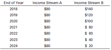 End of Year Income Stream A Income Stream B 2018 $80 $140 2019 $80 $120 2020 $80 $100 2021 $80 $ 80 2022 $80 $60 2023 $80 $ 40 2024 $80 $ 20