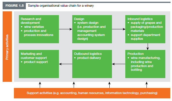 FIGURE 1.5 Sample organisational value chain for a winery Primary activities Research and development • wine varieties • production and process innovations Marketing and customer support • product support Design • system design (i.e. production and management accounting system design) Outbound logistics • product delivery Inbound logistics • supply of grapes and packaging/production materials support department supplies Production • wine manufacturing, including wine production and bottling Support activities (e.g. accounting, human resources, information technology, purchasing)