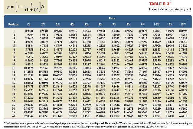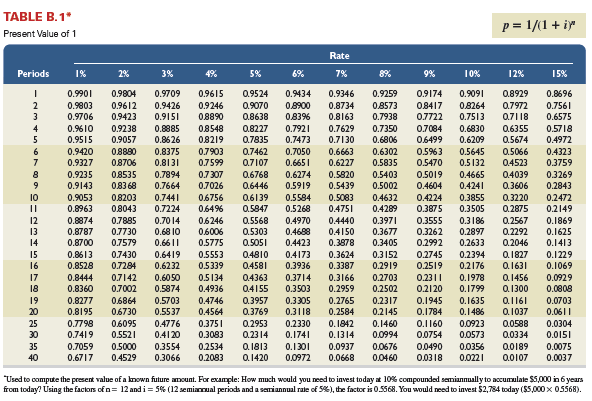 TABLE B.1* p = 1/(1 + i" Present Value of 1 Rate Periods 1% 2% 3% 4% 5% 6% 7% 8% 9% 1 0% 12% 15% 0.9901 0.9804 0.9709 0.9615 0.9524 0.9434 0.8900 0.839% 0.9346 0.9259 09174 0.9091 0.8929 0.8696 2 0.9803 0.9612 0.9426 0.9246 0.9070 0.8734 0.8573 08417 0.8264 0.7972 0.7561 3 0.9706 0.9423 0.9151 08890 0.8638 0.8163 0.7938 0.7722 0.7513 0.7118 0.6575 0.7921 0.7473 4 0.9610 0.9238 0.8885 08548 0.8227 0.7629 0.7350 0.7084 0.6830 0.6355 0.5718 5 0.9515 0.9057 0.8626 08219 0.7835 0.7130 0.6806 06499 0.6209 0.5674 0.4972 0.9420 0.8890 0.8375 0.7903 0.7462 0.7050 0.5645 0.5066 0.6663 0.6227 0.6302 0.5%3 0.4323 0.7599 0.7307 0.7026 0.9327 0.706 0.8131 0.7107 0.6651 0.5835 0.5470 0.5 132 0.4523 0.3759 8 0.9235 0.9143 0.8535 0.7894 0.6768 0.6274 0.5820 0.5403 0.5019 0.4665 0.4241 0.4039 0.3269 0.8368 0.7664 0.6446 0.5919 0.5439 0.5002 0.4604 0.3606 0.2843 08203 0.4632 0.4289 10 0.9053 0.7441 0.6756 0.6139 0.5584 0.5083 0.4224 0.3855 0.3220 0.2472 %3D 0.8963 0.8043 0.7224 0.64% 0.5847 0.5268 0.4751 0.3875 0.3505 0.2875 0.2149 12 0.8874 0.7885 0.7014 0.6246 0.5568 0.5303 0.4970 0.4440 0.3971 0.3555 0.3186 0.2567 0.1869 0.8787 0.8700 13 0.7730 0.68 10 0.6006 0.4688 0.4150 0.3677 0.3262 0.2897 0.2292 0.1625 14 0.7579 0.66 || 0.5775 0.5051 0.4423 0.3878 0.3405 0.2992 0.2633 0.2046 0.1413 15 0.8613 0.7430 0.6419 0.5553 0.4810 0.4173 0.3624 0.3152 0.2745 0.2394 0.1827 0.1229 0.2519 0.2311 16 0.8528 0.7284 0.6232 0.5339 0.4581 0.3936 0.3387 0.2919 0.2176 0.1631 0.1069 17 0.8444 0.7142 05134 0.3714 0.60 50 0.5874 0.4363 0.3166 0.2703 0.1978 0.1456 0.0929 18 0.8360 0.7002 0.4936 0.4155 0.3503 0.2959 0.2502 0.2120 0.1799 0.1300 0.0808 0.8277 0.8195 19 0.6864 0.5703 0.4746 0.3957 0.3305 0.2765 0.2317 0.1945 0.1635 0.1161 0.0703 20 0.6730 0.5537 0.4564 0.3769 0.3118 0.2584 0.2145 0.1784 0.1486 0.1037 0.06|| 25 0.7798 0.6095 0.4776 0.3751 0.2953 0.2314 0.2330 0.1842 0.1460 0.1160 0.0923 0.0588 0.0334 0.0304 30 0.7419 0.5521 0.4120 0.3083 0.1741 0.1314 0.0994 0.0754 0.0573 0.0151 0.3554 0.1813 0.1420 35 0.7059 0.5000 0.2534 0.1301 0.0937 0.0676 0.0460 0.0490 0.0356 0.0189 0.0075 0.0037 40 0.6717 0.4529 0.3066 0.2083 0.0972 0.0668 0.0318 0.0221 0.0107 "Used to compute the present value of a known future amount. For example: How much would you need to invest today at 10% compounded semiannually to accumulate $5,000 in6years from today? Using the factors of n= 12 and i= 5% (12 semiamual periods and a semiannual rate of 5%), the factor is 0.5568. You would need to invest $2,784 today ($5,000 x 05568). %3D TABLE B.3* p = (1 + i)" Present Value of an Annuity of 1 Rate Periods 1% 2% 3% 4% 5% 6% 7% 8% 9% 10% 12% 15% 0.9901 0.9804 0.9709 0.9615 0.9524 0.9434 0.9346 0.9259 0.9174 0.9091 0.8929 0.8696 1.9704 1.9416 1.9135 1.8861 1.8594 1.8334 1.8080 1.7833 1.7591 1.7355 1.6901 1.6257 3 2.9410 2.8839 2.8286 2.7751 2.7232 2.6730 2.6243 2.5771 2.5313 2.4869 2.4018 2.2832 4 3.9020 3.8077 3.7171 3.6299 3.5460 3.4651 3.3872 3.3121 3.2397 3.1699 3.0373 2.8550 5 4.8534 4.71 35 4.5797 4.4518 4.3295 4.2124 4.1002 3.9927 3.8897 3.7908 3.6048 3.3522 5.7955 5.6014 5.4172 5.2421 5.0757 4.9173 4.7665 4.6229 4.4859 4.3553 4.1114 3.7845 7 6.7282 6.4720 6.2303 6.0021 5.7864 5.5824 5.3893 5.2064 5.0330 4.8684 4.5638 4.1604 8 7.6517 7.3255 7.0197 6.7327 6.4632 6.2098 5.9713 5.7466 5.5348 5.3349 4.9676 4.4873 8.5660 8.1622 7.7861 7.4353 7.1078 6.8017 6.5152 6.2469 5.9952 5.7590 5.3282 4.7716 9.4713 10.3676 10 8.9826 8.5302 81109 7.7217 7.3601 7.0236 6.7101 6.4177 6.1446 5.6502 5.0188 9.7868 9.2526 8.7605 8.3064 7.8869 74987 7.1390 6.8052 6.4951 5.9377 5.2337 12 11.2551 10.5753 9.9540 9.3851 8.8633 8.3838 7.9427 7.5361 7.1607 6.8137 6.1944 5.4206 13 12.1337 I1.3484 10.6350 9.9856 9.3936 8.8527 8.3577 7.9038 7.4869 7.1034 6.4235 5.5831 14 13.0037 12.1062 11.2961 10.5631 9.8986 9.2950 8.7455 8.2442 7.7862 7.3667 6.6282 5.7245 15 13.8651 12.8493 I1.9379 IL1184 10.3797 9.7122 9.1079 8.5595 8.0607 7.6061 6.8109 5.8474 16 14.7179 13.5777 12.5611 I1.6523 10.8378 10.1059 94466 8.8514 8.3126 7.8237 6.9740 5.9542 17 15.5623 14.2919 13.1661 12.1657 11.2741 10.4773 9.7632 9.1216 8.5436 8.0216 7.1196 6.0472 18 16.3983 14.9920 13.7535 126593 I1.6896 10.8276 10.0591 9.3719 8.7556 8.2014 7.2497 6.1280 10.3356 10.5940 I1.6536 124090 19 17.2260 15.6785 14.3238 13.1339 9.6036 12.0853 12.4622 IL.1581 8.9501 8.3649 7.3658 6.1982 20 18.0456 16.3514 14.8775 13.5903 11.4699 9.8181 9.1285 8.5136 7.4694 6.2593 25 22.0232 19.5235 17.4131 15.6221 14.0939 12.7834 10.6748 9.8226 9.0770 7.8431 6.4641 30 25.8077 22.3965 19.6004 17.2920 153725 13.7648 11.2578 10.2737 9.4269 8.0552 6.5660 35 29.4086 24.9986 21 4872 18.6646 16.3742 14.4982 12.9477 I1.6546 10.5668 9.6442 8.1755 6.6166 40 32.8347 27.3555 23.1148 19.7928 17.1591 15.0463 13.3317 I1.9246 10.7574 9.7791 8.2438 6.6418 "Used to calculate the present value of a series of equal payments made at the end of cach period. For example: What is the present value of $2,000 per year for 10 years assuming an annal interest rate of 9%. For (n - 10, i- 9%), the PV factor is 6.4177. $2,000 per year for 10 years is the equivalent of $12,835 today ($2,000 x 6.4177).