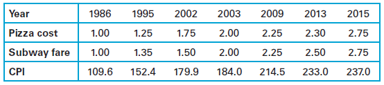 > Using the CPI values from the above table and Table 2.2, determine what a slice of pizza should have cost in 2010 if it cost $1.00 in 1986 and prices had risen with the CPI. What does this tell you about how actual pizza prices changed compared to the CP