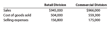 Retall Division Commerclal Division Sales $945,000 $966,000 Cost of goods sold Selling expenses 504,000 559,300 156,800 175,000