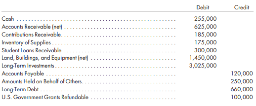 Debit Credit Cash 255,000 625,000 185,000 175,000 300,000 1,450,000 3,025,000 Accounts Receivable (net) Contributions Receivable. Inventory of Supplies.. Student Loans Receivable Land, Buildings, and Equipment (net) Long-Term Investments. Accounts Payable . Amounts Held on Behalf of Others. 120,000 250,000 660,000 100,000 Long-Term Debt .... U.S. Government Grants Refundable