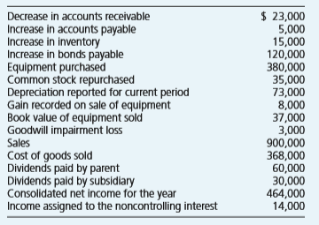 $ 23,000 5,000 15,000 120,000 380,000 35,000 73,000 8,000 37,000 3,000 900,000 368,000 60,000 30,000 464,000 14,000 Decrease in accounts receivable Increase in accounts payable Increase in inventory Increase in bonds payable Equipment purchased Common stock repurchased Depreciation reported for current period Gain recorded on sale of equipment Book value of equipment sold Goodwill impairment loss Sales Cost of goods sold Dividends paid by parent Dividends paid by subsidiary Consolidated net income for the year Income assigned to the noncontrolling interest
