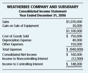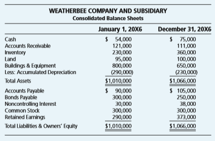 WEATHERBEE COMPANY AND SUBSIDIARY Consolidated Balance Sheets January 1, 20X6 $ 54,000 121,000 230,000 December 31, 20X6 Cash Accounts Receivable $ 75,000 111,000 360,000 Inventory Land Buildings & Equipment Less: Accumulated Depreciation 95,000 800,000 (290,000) 100,000 650,000 (230,000) $1,010,000 $ 90,000 300,000 30,000 $1,066,000 $ 105,000 250,000 38,000 Total Assets Accounts Payable Bonds Payable Noncontrolling Interest Common Stock Retained Earnings 300,000 290,000 300,000 373,000 Total Liabilities & Owners' Equity $1,010,000 $1,066,000 WEATHERBEE COMPANY AND SUBSIDIARY Consolidated Income Statement Year Ended December 31, 20X6 Sales Gain on Sale of Equipment $1,070,000 30,000 $1,100,000 $ 750,000 40,000 150,000 Cost of Goods Sold Depreciation Expense Other Expenses $ (940,000) $ 160,000 (12,000) Total Expenses Consolidated Net Income Income to Noncontrolling Interest Income to Controlling Interest $ 148,000 WEATHERBEE COMPANY AND SUBSIDIARY Consolidated Retained Earnings Statement Year Ended December 31, 20X6 Balance, January 1, 20X6 Income to Controlling Interest $290,000 148,000 $438,000 (65,000) Dividends Decdared, 20X6 Balance, December 31, 20X6 $373,000