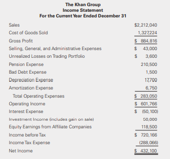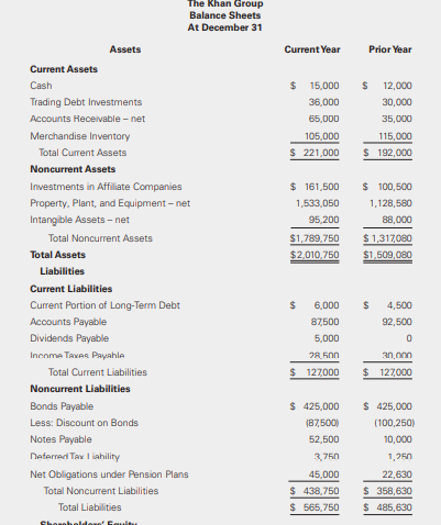 > The Khan Group provided its balance sheet and income statement as of December 31 of the current year. Additional Information: • The company classifies its current investments as trading securities. During the current year, it sold tradi