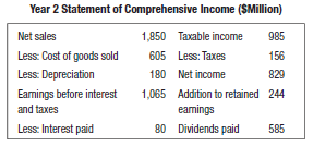 Year 2 Statement of Comprehensive Income (SMillion) Net sales 1,850 Taxable income 985 Less: Cost of goods sold 605 Less: Taxes 156 Less: Depreciation 180 Net income 829 Eamings before interest 1,065 Addition to retained 244 and taxes eamings Less: Interest paid 80 Dividends paid 585