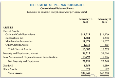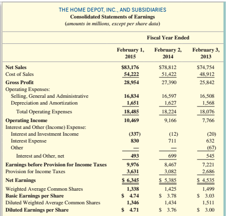 THE HOME DEPOT, INC., AND SUBSIDIARIES Consolidated Statements of Earnings (amounts in millions, except per share data) Fiscal Year Ended February 1, February 2, February 3, 2013 2015 2014 Net Sales $83,176 54,222 $78,812 $74,754 Cost of Sales 51,422 48,912 Gross Profit 28,954 27,390 25,842 Operating Expenses: Selling, General and Administrative Depreciation and Amortization 16,834 16,597 16,508 1,651 1,627 1,568 Total Operating Expenses 18,485 18,224 18,076 7,766 Operating Income Interest and Other (Income) Expense: 10,469 9,166 Interest and Investment Income (337) (12) (20) Interest Expense 830 711 632 Other (67) Interest and Other, net 493 699 545 Earnings before Provision for Income Taxes 9,976 3,631 8,467 7,221 Provision for Income Taxes 3,082 2,686 Net Earnings $ 6,345 $ 5,385 $ 4.535 Weighted Average Common Shares Basic Earnings per Share Diluted Weighted Average Common Shares Diluted Earnings per Share 1,338 $ 4.74 1,346 $ 4.71 1,425 1,499 $ 3.78 $ 3.03 1,434 1,511 $ 3.76 $ 3.00 THE HOME DEPOT, INC., AND SUBSIDIARIES Consolidated Balance Sheets (amounts in millions, except share and per share data) February 1, February 2, 2015 2014 ASSETS Current Assets: Cash and Cash Equivalents $ 1,723 $ 1,929 1,484 11,079 1,016 Receivables, net 1,398 Merchandise Inventories 11,057 Other Current Assets 895 Total Current Assets 15,302 15,279 Property and Equipment, at cost Less Accumulated Depreciation and Amortization 38,513 39,064 15,793 15,716 Net Property and Equipment 22,720 23,348 Goodwill 1,353 1,289 Other Assets 571 602 Total Assets $39,946 $40,518