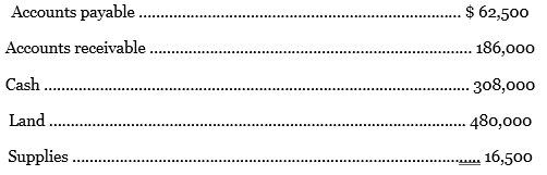 Accounts Payable $ 62,500 Accounts receivable 186,000 Cash -308,000 Land 480,000 Supplies 16,500 Fees earned. $1,475,000 ..... Office expense 320,000 ......... Miscellaneous expense 28,000 Wages expense 885,000