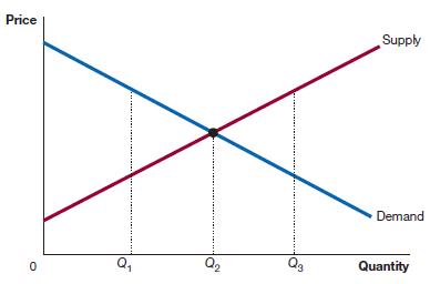 Using the following graph, explain why economic surplus would be smaller if Q1 or Q3 were the quantity produced than if Q2 is the quantity produced.