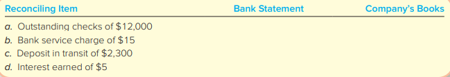 > Indicate whether the following items would be added (+) or subtracted (−) from the company’s books or the bank statement side of a bank reconciliation.