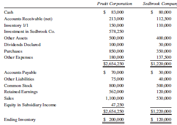 Pruti Corporation Sedbrook Compan $ 0,000 $ 83,000 213,000 Cash Accounts Receivable (net) 112,500 Inventory 1/1 150,000 110,000 Investment in Sedbrook Co. 578,250 Other Assets S00,000 400,000 Dividends Declare d 100,000 30,000 Purchases 850,000 350,000 Other Expenses 180,000 137,500 $2,654,250 $1,220,000 Accounts Payable $ 70,000 $ 30,0000 Other Liabilities 75,000 40,000 Common Stock 800,000 50,000 Retained Earnings 562,000 120,000 Saks 1,100,000 530,000 Equity in Subsidiary Income 47,250 $2,654,250 $1,220,000 Ending Inventory $ 200,000 $ 120,000 Pruti Corporation Sedbrook Compan $ 0,000 $ 83,000 213,000 Cash Accounts Receivable (net) 112,500 Inventory 1/1 150,000 110,000 Investment in Sedbrook Co. 578,250 Other Assets S00,000 400,000 Dividends Declare d 100,000 30,000 Purchases 850,000 350,000 Other Expenses 180,000 137,500 $2,654,250 $1,220,000 Accounts Payable $ 70,000 $ 30,0000 Other Liabilities 75,000 40,000 Common Stock 800,000 50,000 Retained Earnings 562,000 120,000 Saks 1,100,000 530,000 Equity in Subsidiary Income 47,250 $2,654,250 $1,220,000 Ending Inventory $ 200,000 $ 120,000
