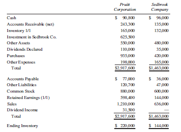 Pruitt Sedbrock Carporation Company Cash $ 90,800 $ 96,000 Accounts Receivabk (net) 243,300 135,000 165,000 Inventory 1/1 Investment in Sedbrook Ca. 132,000 625,500 Other Assets S50,000 480,000 Dividends Declared 110,000 35,000 Purchases 935,000 420,000 Other Expenses 198,000 $2,917,600 165,000 $1.463,000 Total Accounts Payable Other Liabilitikes $ 7,000 $ 36,000 120,700 47 000 Common Stock 830,000 600,000 Retained Earnings (1/1) 598,400 144,000 Sales 1,210,000 636,000 Dividend Income 31,500 Total $2,917,600 $1,463,000 Ending Inventory $ 220,000 $ 144,000